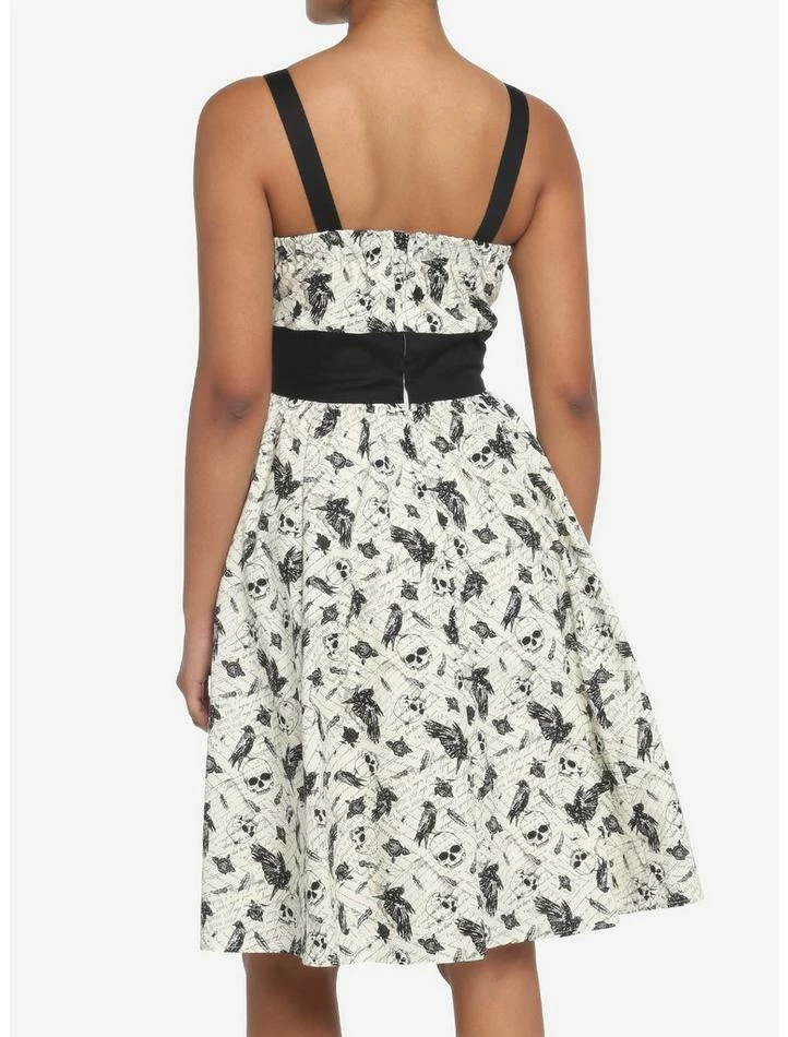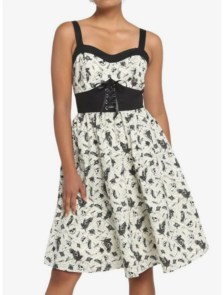 Feelin’ poetic? Add a macabre spin to your retro sense of style! This ivory dress features an allover print of ravens, skulls and poem verses. Comes with corset-inspired lace-up detailing under the bust, a half elasticated back and a back zipper closure. Plus, pockets!