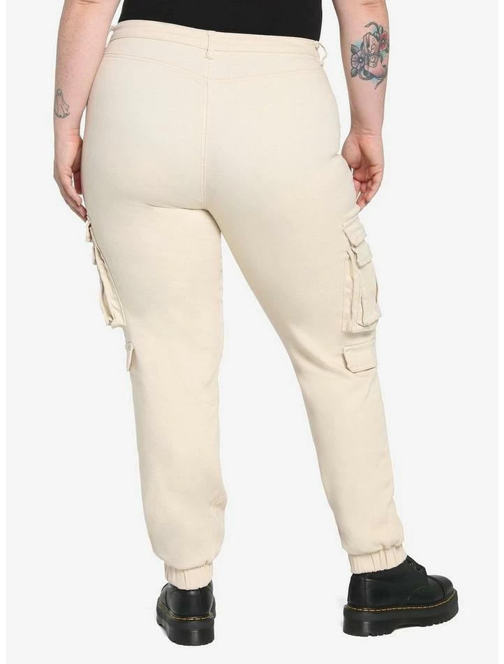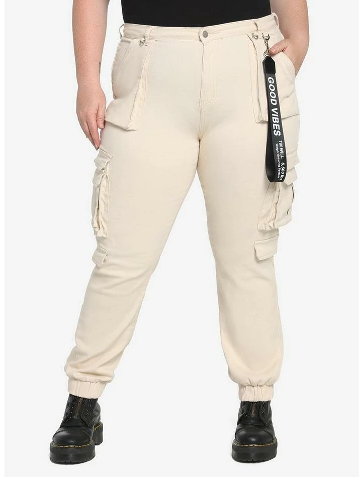 Add more looks to your streetwear collection! These ivory jogger pants feature hip and cargo pockets and elasticated ankles. Comes with a removable “Good vibes” keychain.