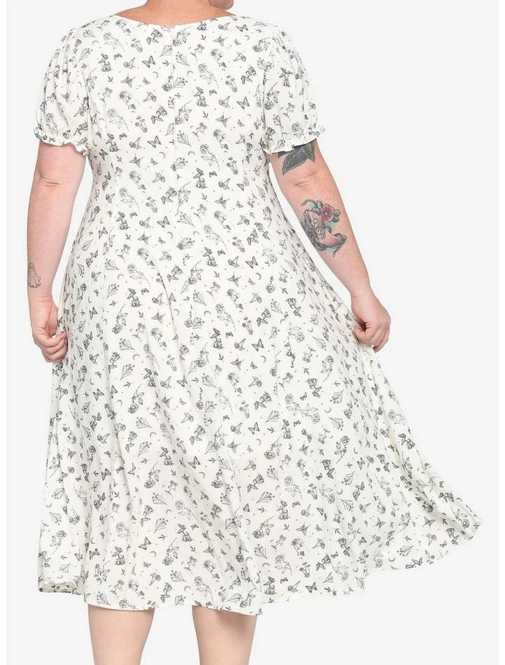 Not your garden variety dress! This ivory empire midi dress features adjustable tie front, puff sleeves, pockets, slip lining and an allover pattern of floral, mushroom and insect designs.