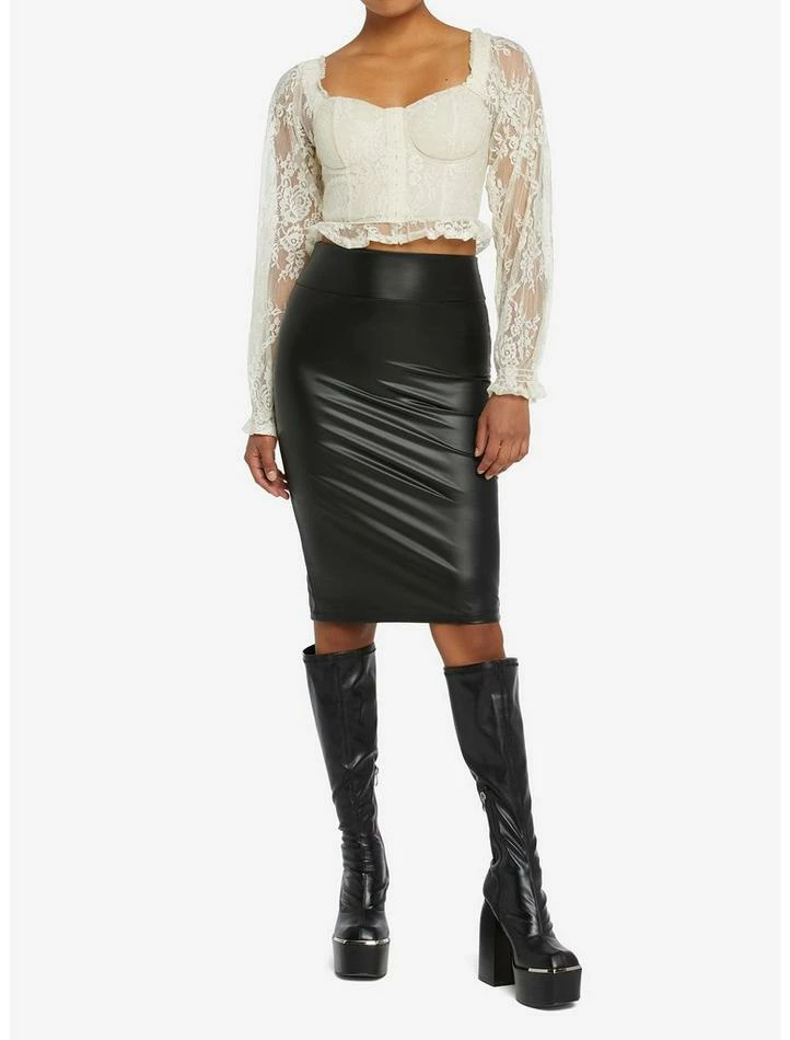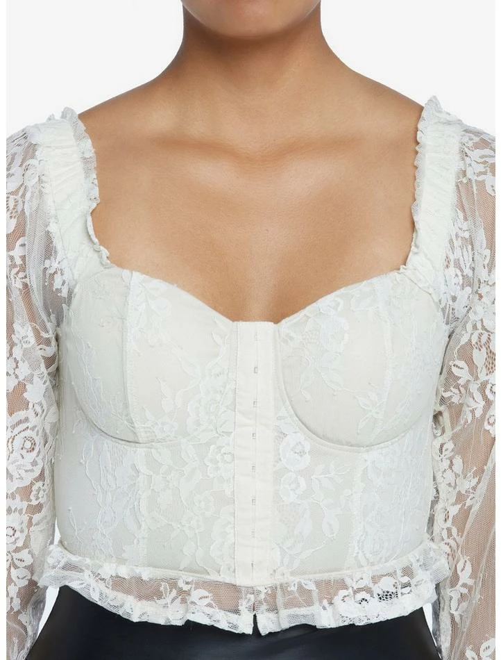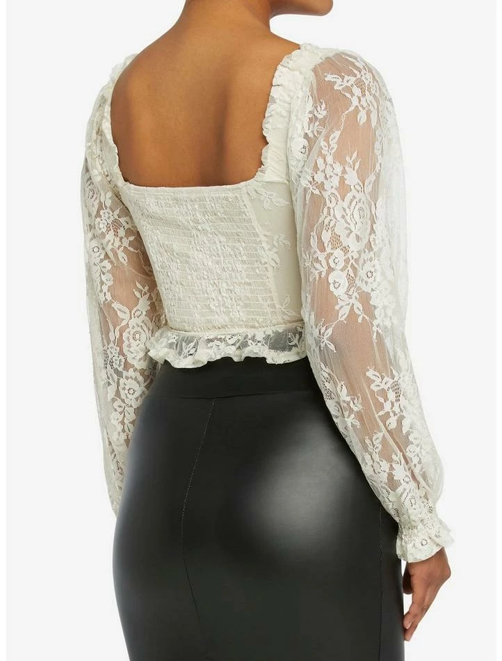 Add some elegance to your look with this ivory lace top featuring sheer long sleeves, ruffle sleeve hem, corset-style detailing with a hook-and-eye accent.