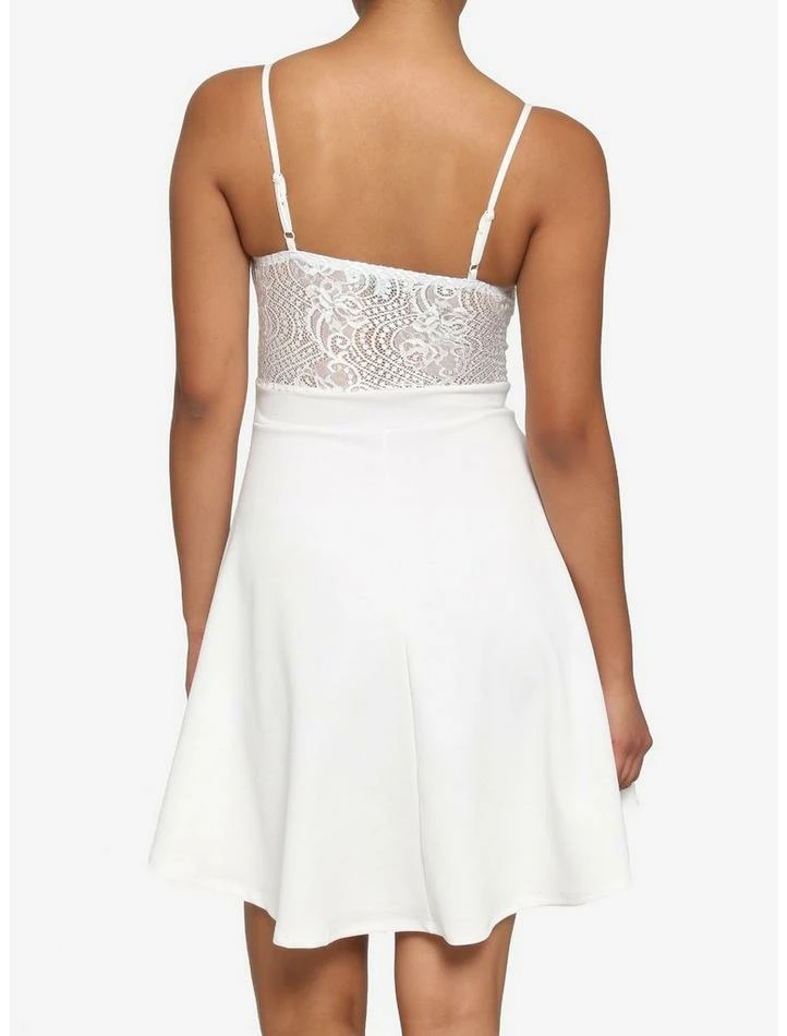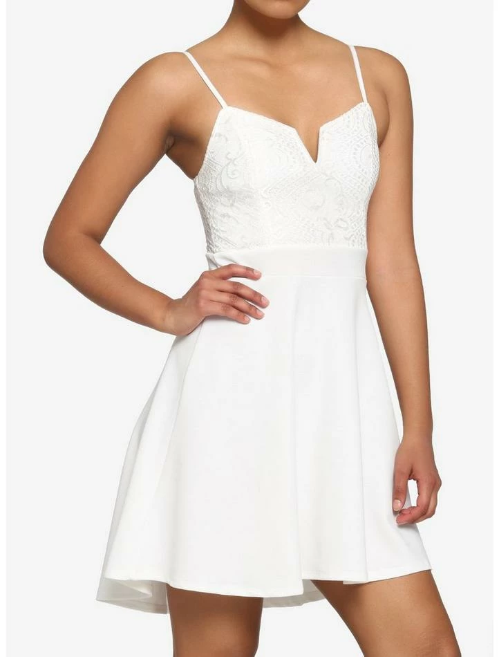 Keep your look poised and elegant this summer in this cute, ivory dress! It has a slight hi-low slhouette and features delicate lace detailing on the bust. It comes with adjustable spaghetti straps and a V-notch at the neckline. It even comes with bust padding for extra support!
