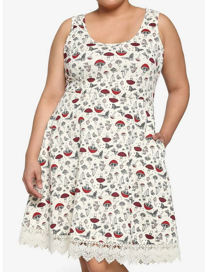 You can never have too many cottagecore looks! This ivory dress features a black, red and blush pink mushroom, star and butterfly print, lace trim on the skirt and pockets.