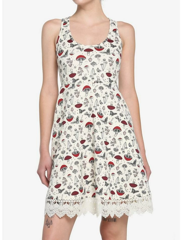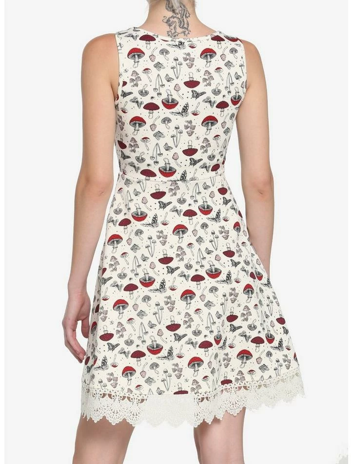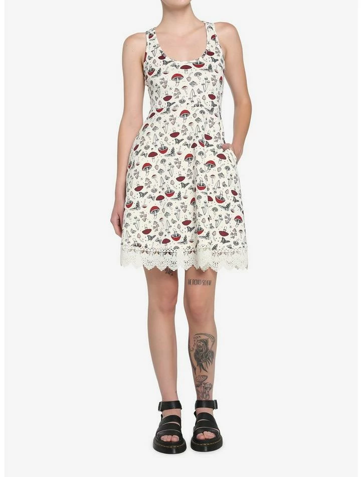 You can never have too many cottagecore looks! This ivory dress features a black, red and blush pink mushroom, star and butterfly print, lace trim on the skirt and pockets.