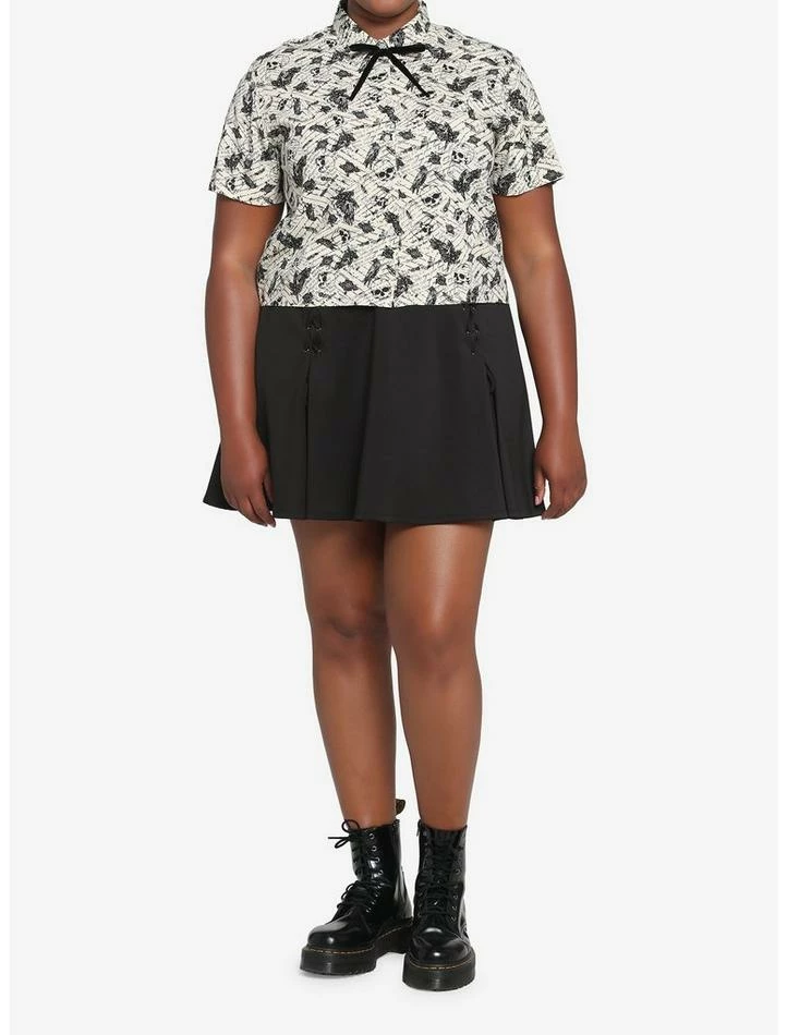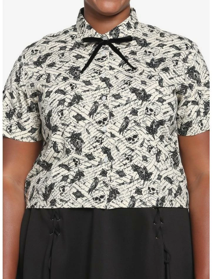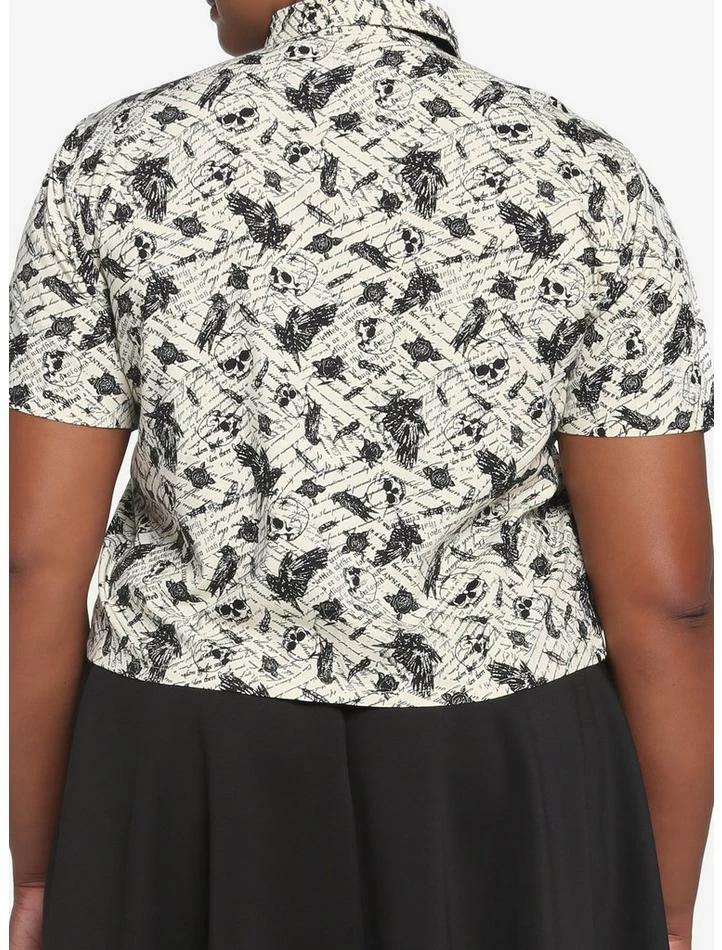 Add a poetic touch to your look with this ivory, woven button-up! It has a boxy, cropped fit and features an allover print of poem verses, skulls and ravens. Complete with white buttons and a soft collar.