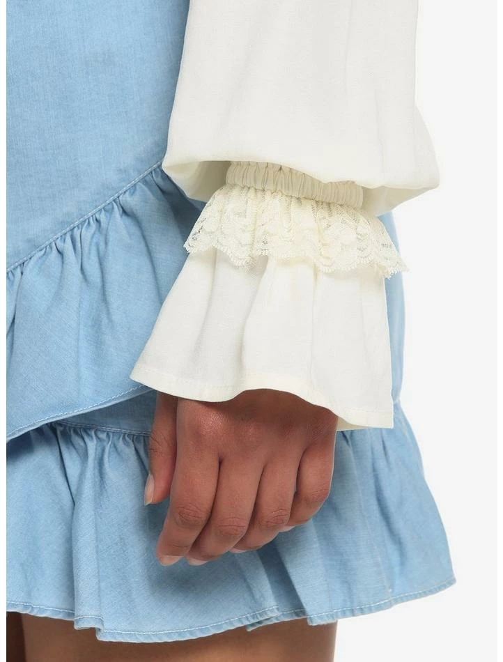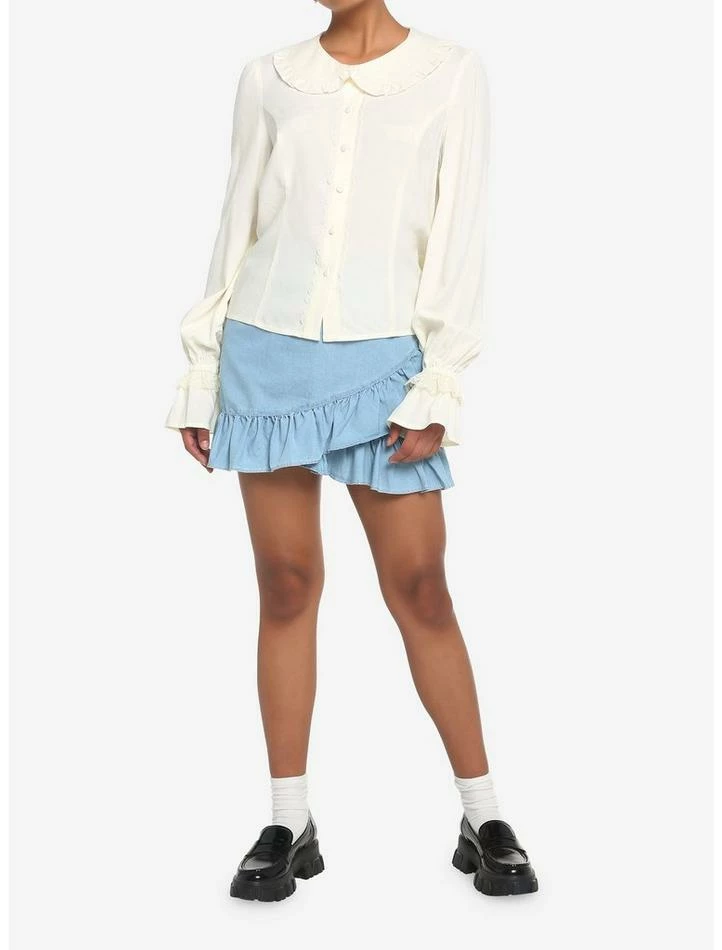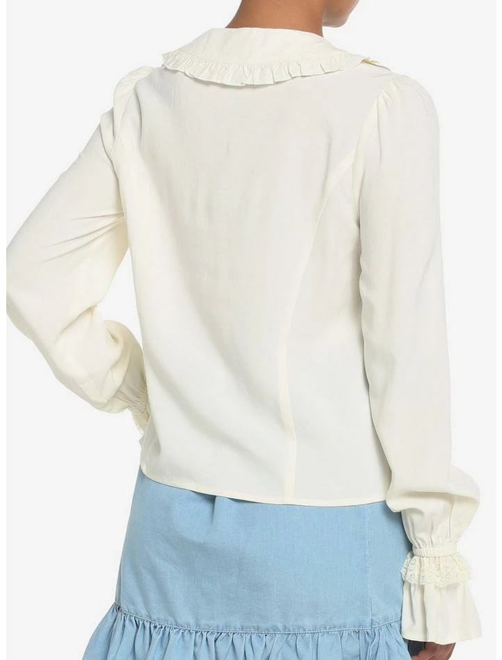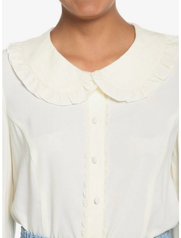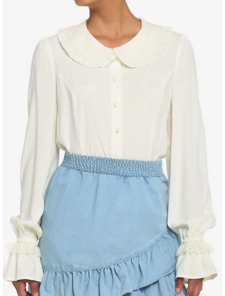 Elevate your style with this classy woven top! This dainty long-sleeve will add some elegance to your OOTD, whether you’re pairing it with a skirt or wearing it as a layered piece. Features princess seams and a ruffled peter pan collar, with matching buttons down the center. Complete with lace detailing down the button placket and on the cinched bell sleeves.