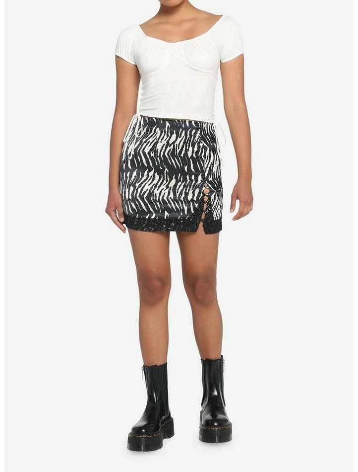 Keep it simple but cute. It’s easy with this cropped ivory rib-knit top, which has drawstring side ruching and puff sleeves.