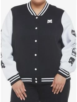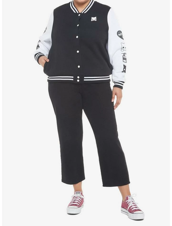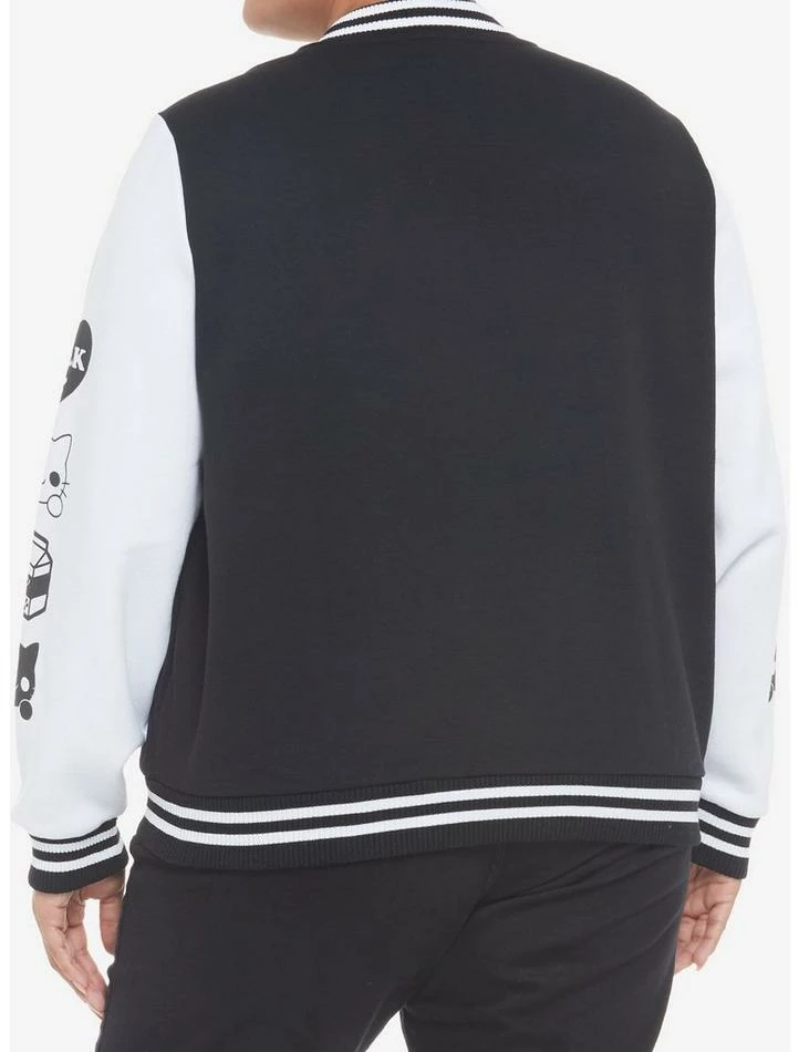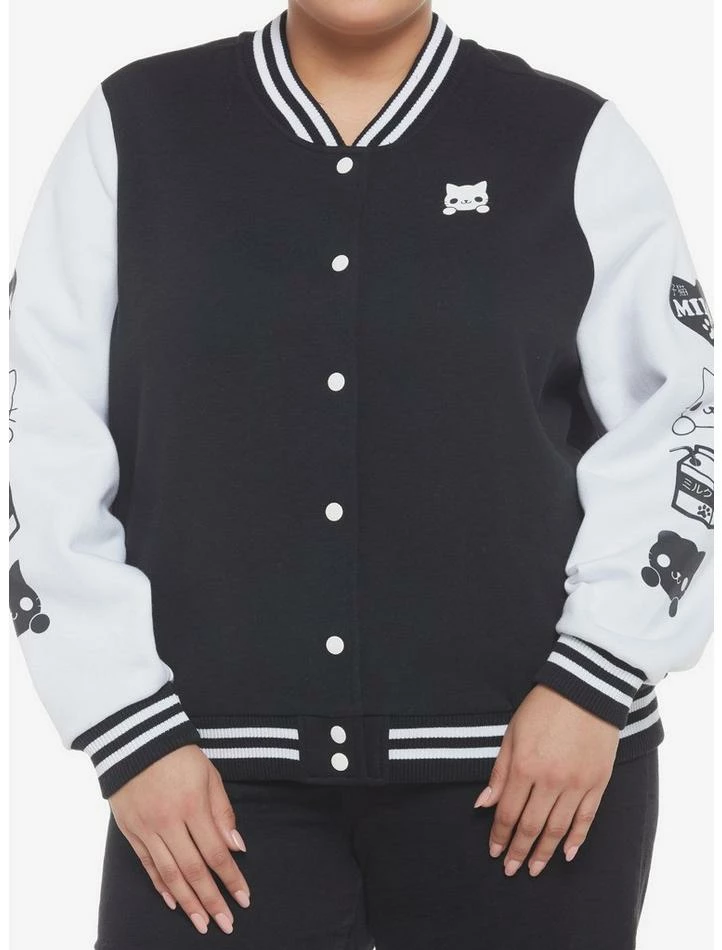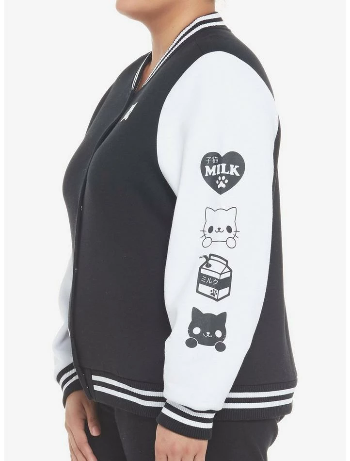 Add this supercute, super-kawaii bomber jacket to your winter wardrobe. It is black and white, with a graphic of a kitten on the chest, and kittens and milk cartons down the sleeves. Button-front closure and side pockets.