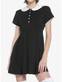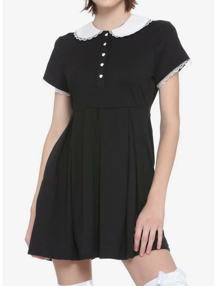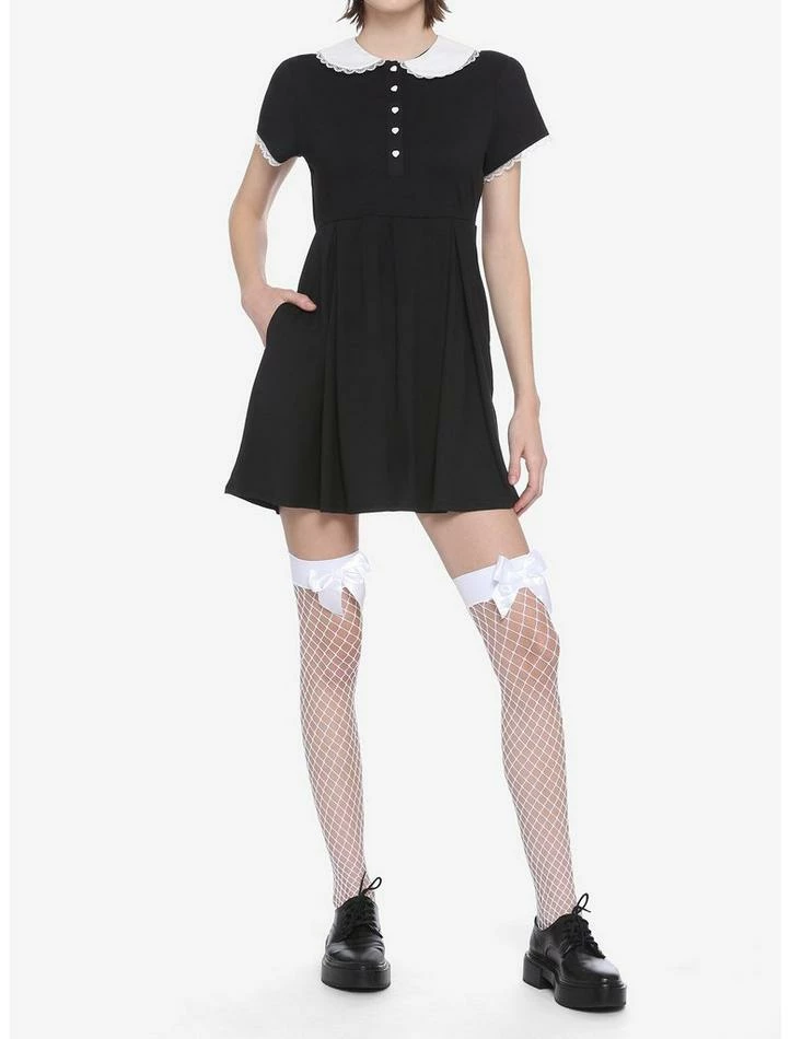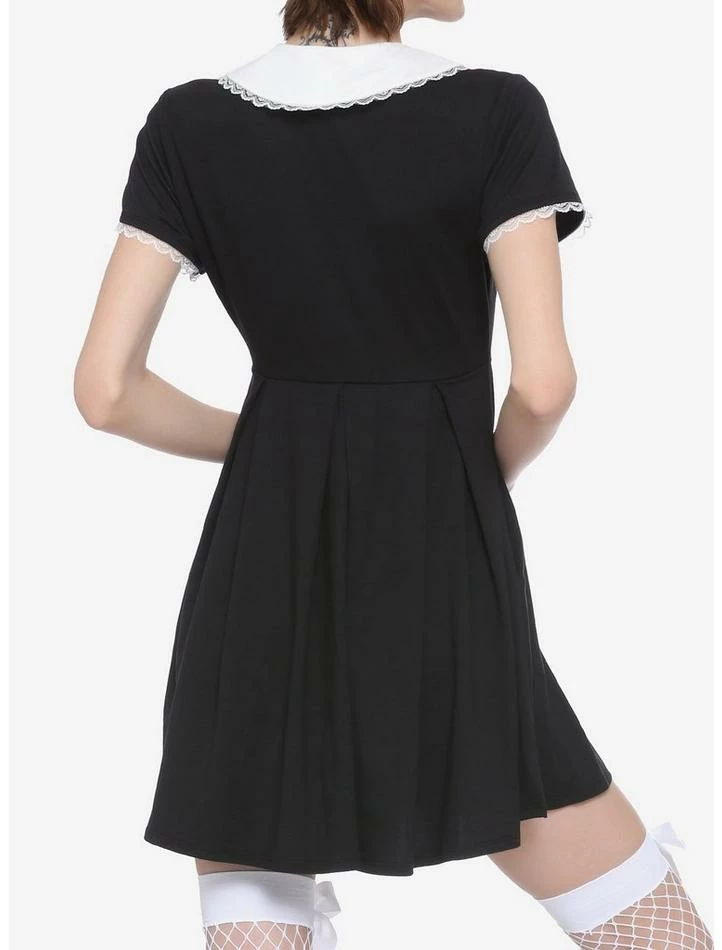 Well isn’t this just the most sppokily cute dress we’ve ever seen! With lace trim on the sleeves and white peter pan collar, it features hip pockets and a contrasting white 5 front button closure.