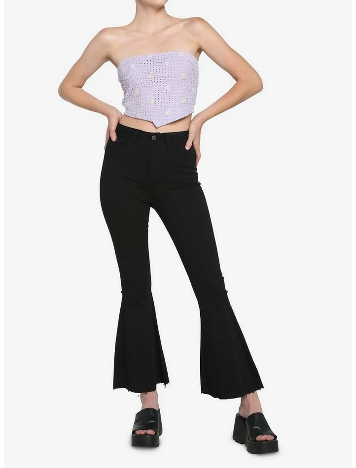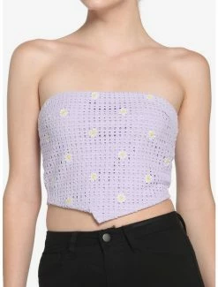 Keep it fun and flirty this summer in a cute, new top! This lavender, bandana tube top is perfect for keeping you cool in the scorching heat. It comes lined and features daisies embroidered all over netted fabric. Complete with a V-hem and back tie straps.