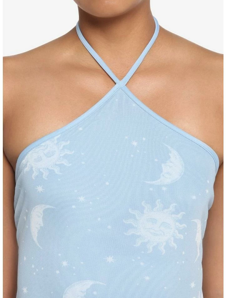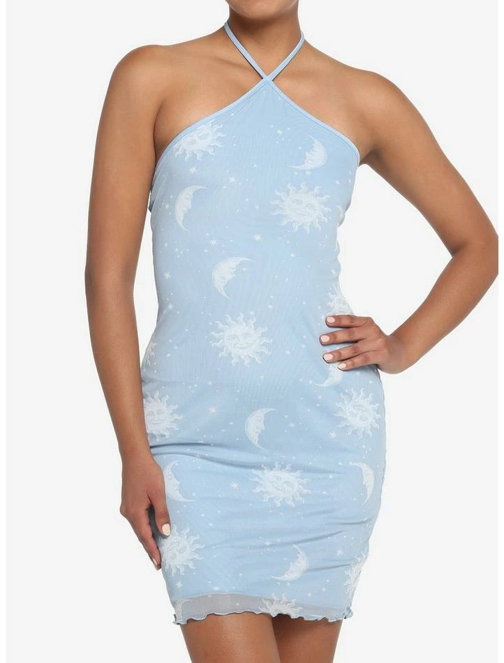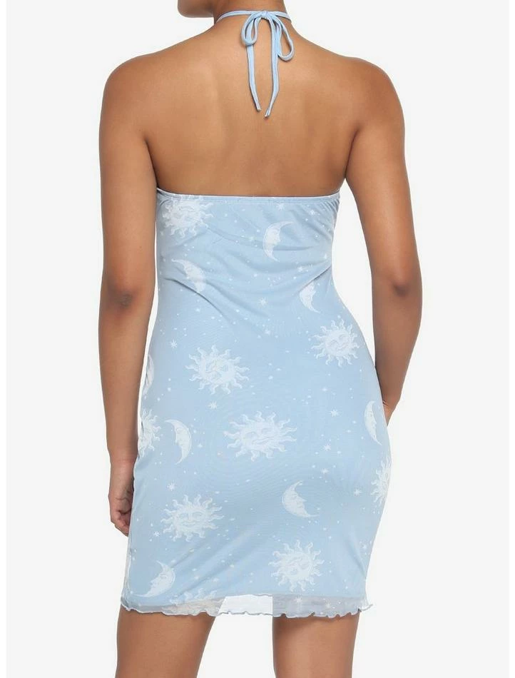 Take your look to the stars in this supercute piece! This light blue dress features a mesh layer printed with suns, moons and stars. Comes with lettuce trimming and halter tie straps.