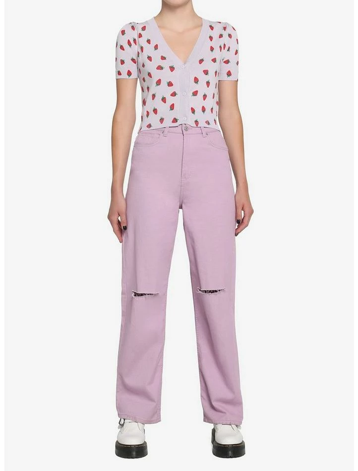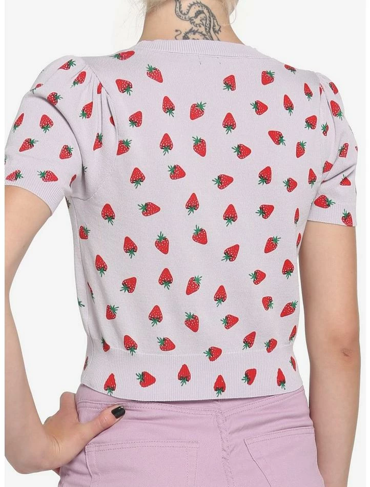 Get your daily serving of fruit in this lilac cardigan featuring a strawberry print, front-button closure and cropped length.