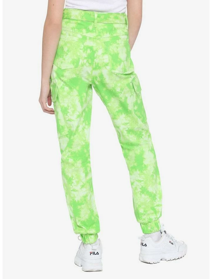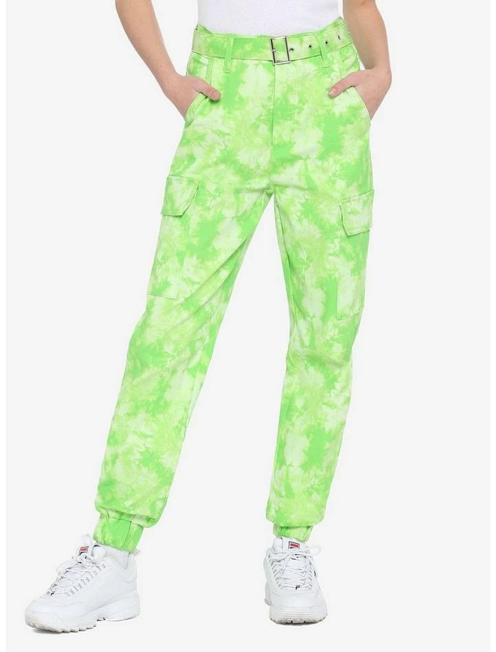 ย Go bright and go bold in these lime green tie-dye cargo pants! They have hip and back pockets with cargo pockets on the sides, button and zipper closure and elastic tapered ankles. Belt included. Pair with your favorite band tee and boots for an effortlessly cool look.