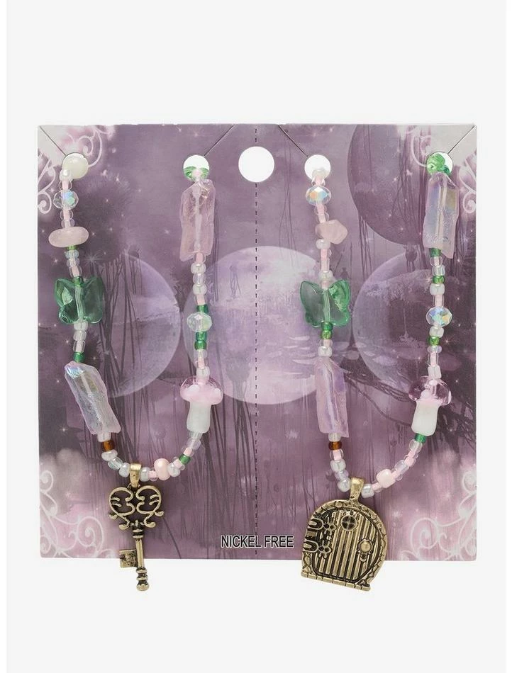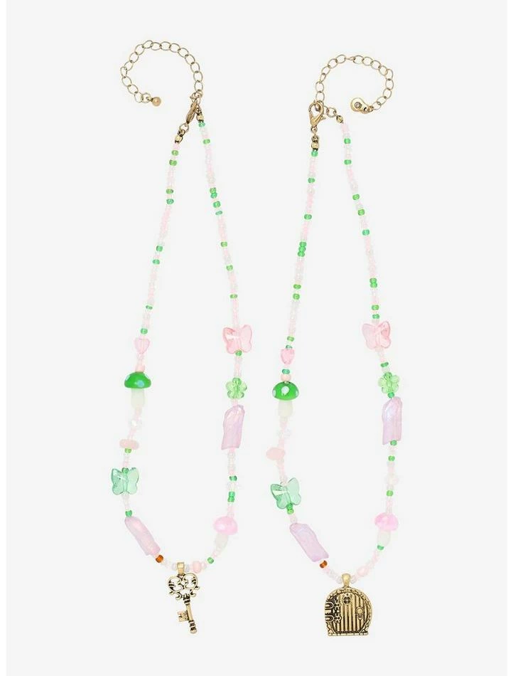 Lock down some matching necklaces with your BFF! This beaded necklace set will add some whimsical vibes to your outfit while matching with your bestie. The set features pink and green beads throughout, with a secret key charm on one and a mysterious door charm on the other.
