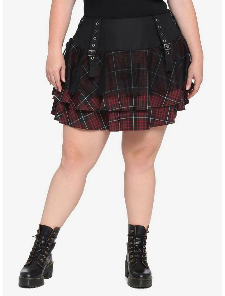 There’s nothing basic about this skirt! It features a black yoke with a black tulle layer and two maroon plaid layers. Features black straps with silver tone grommets and buckles, functional side lace-up detailing and back zipper closure.