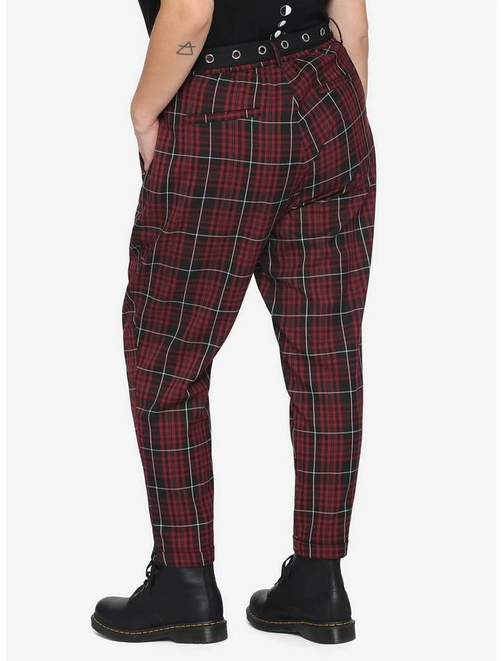 Some classic merlot plaid pants are a must-have for every alt ensemble. These pants feature a detachable grommet belt, elastic back waistband, cuffed ankles and O-ring hardware detail.