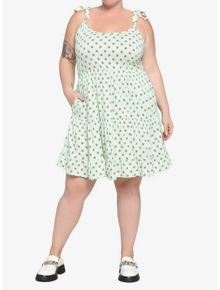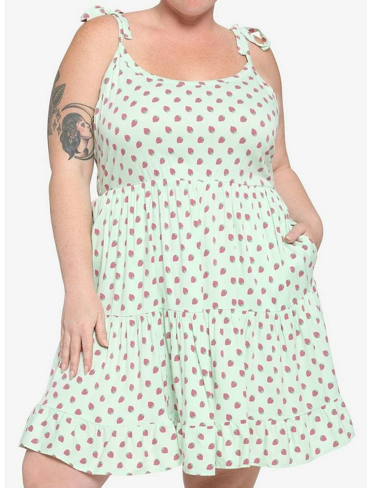 Feel as fresh as a strawberry in this spring-ready dress. It features an allover strawberry print against a woven mint background, with tie straps, pockets, elastic stretch in the waistband and a tiered fit.