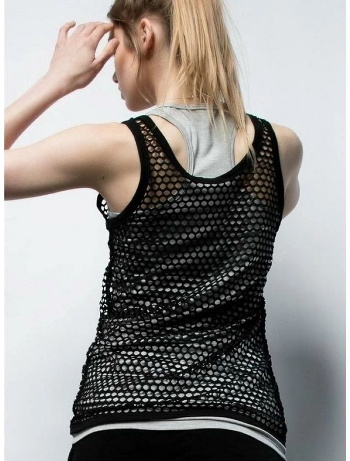 Diamond mesh tank with solid trim at neckline, armhole and bottom hems.