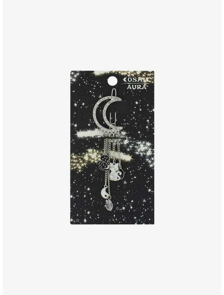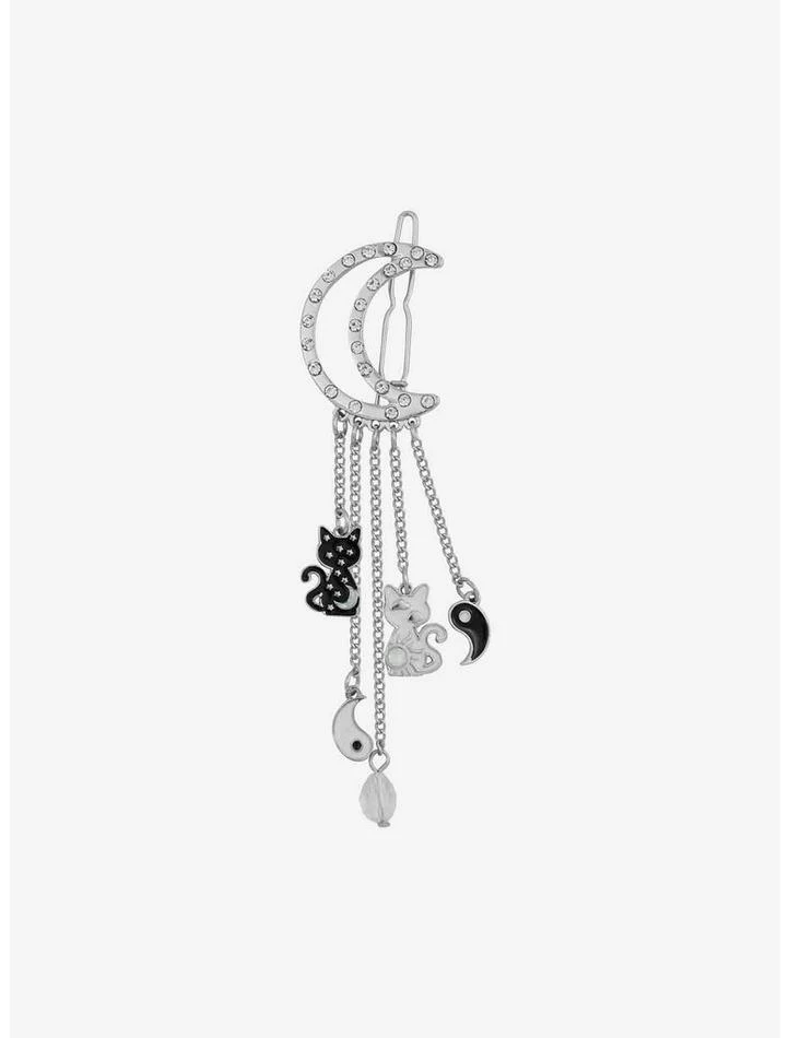 Cats love to get up to mischief at night and follow the phases of the moon. This hair clip is inspired by kitties’ nighttime shenanigans, and features a bejeweled crescent moon with yin yang cat drops.