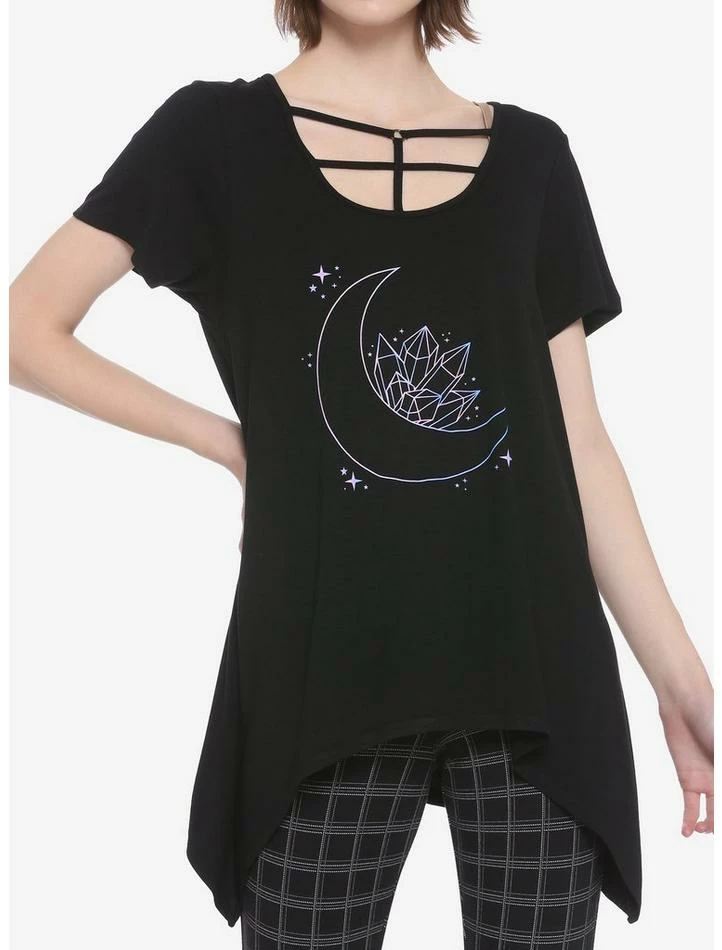Waiting for a full moon to recharge your crystals? This soft black top has a shark bit hem and strappy chest detail. There is a pink & blue outline of a crescent moon with a cluster of crystals.