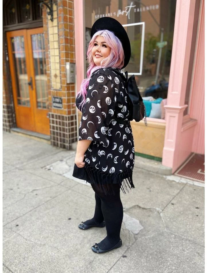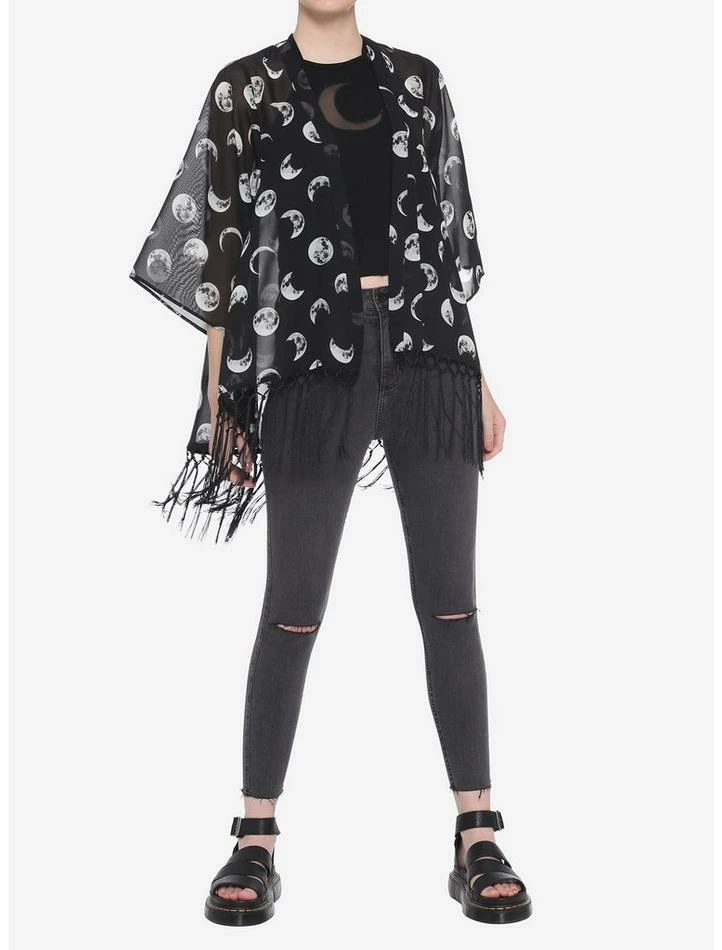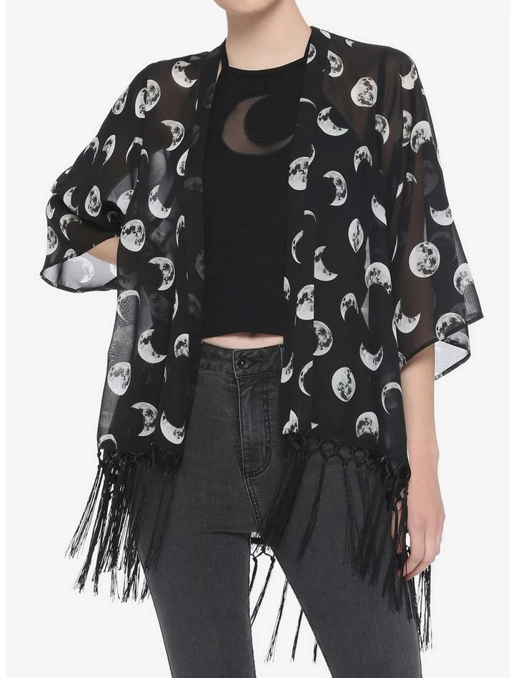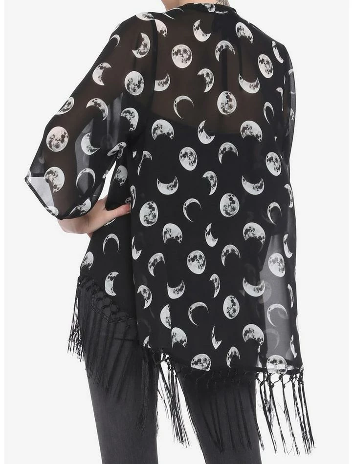 This duster isn’t just a phase! Wear the black and white chiffon layer over almost everything. Featuring an allover moon phase print, a silky black tassel hem and short sleeves.