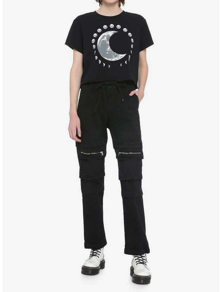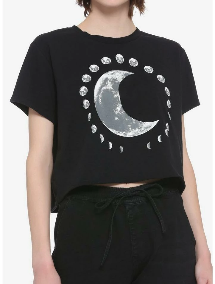 It’s not just a phase! Moon love is for life! This black cropped tee is printed a crescent moon in the center with all the phases of the moon around in a circle.