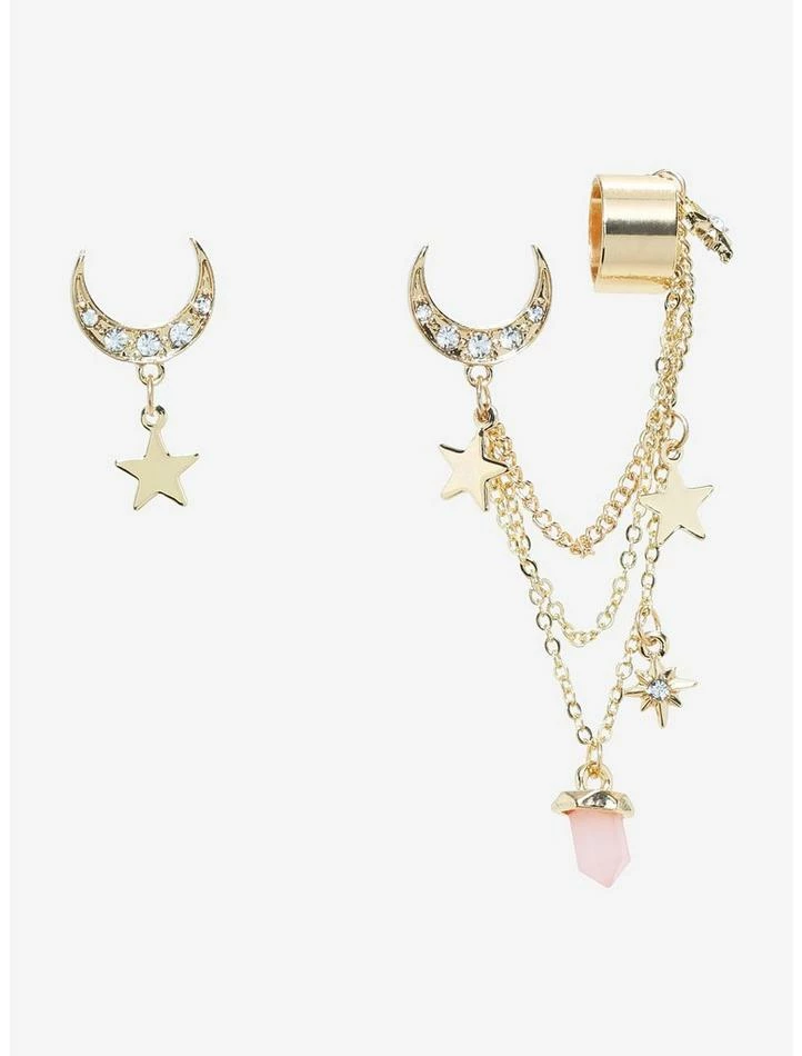 Sparkle like the stars with these cuff earrings! Featuring a gold-tone earring with crescent moon and star charms, adorned with CZ crystals. Plus, a cuff earring with chain detailing and more charms.