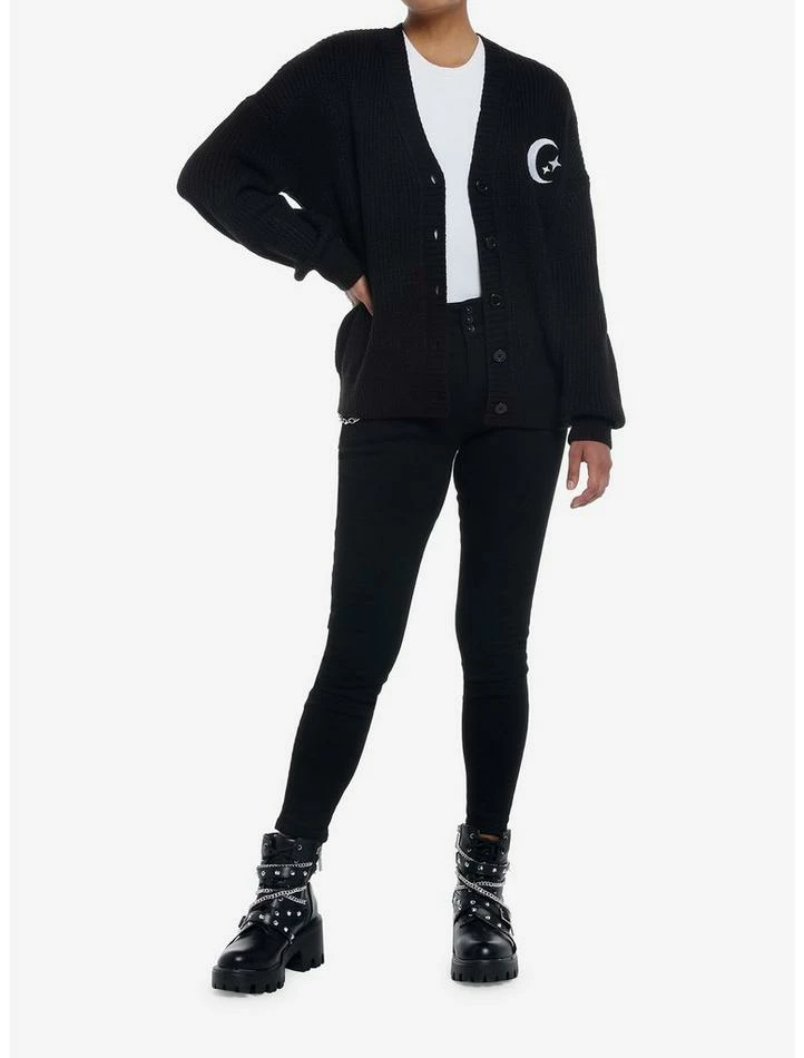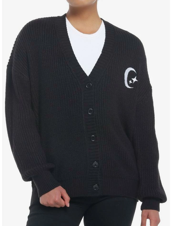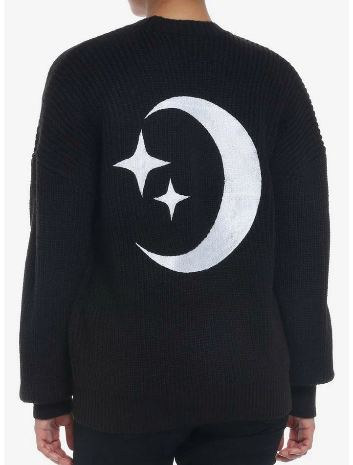 Let the heavens guide you to this cardigan! This black knit cardi has an oversized fit and the chest and back are embroidered with a large crescent moon and stars.