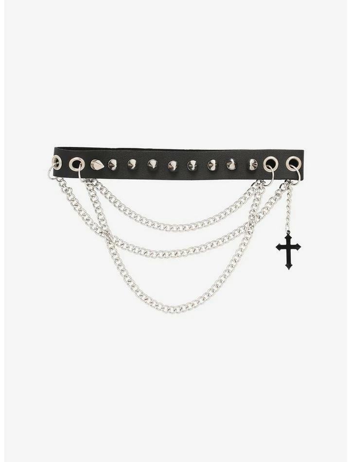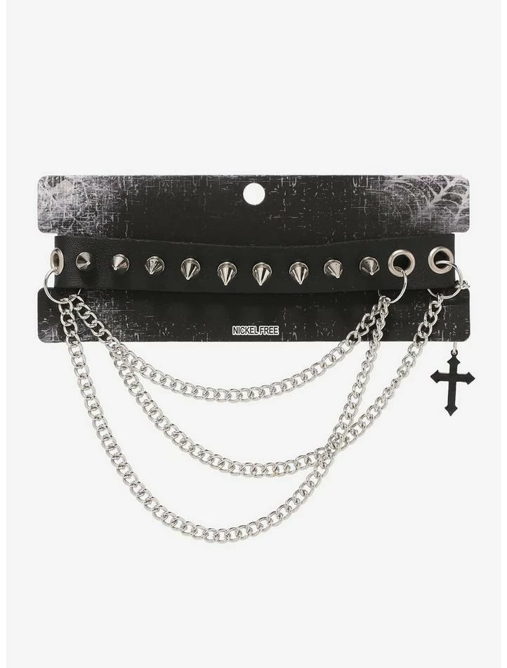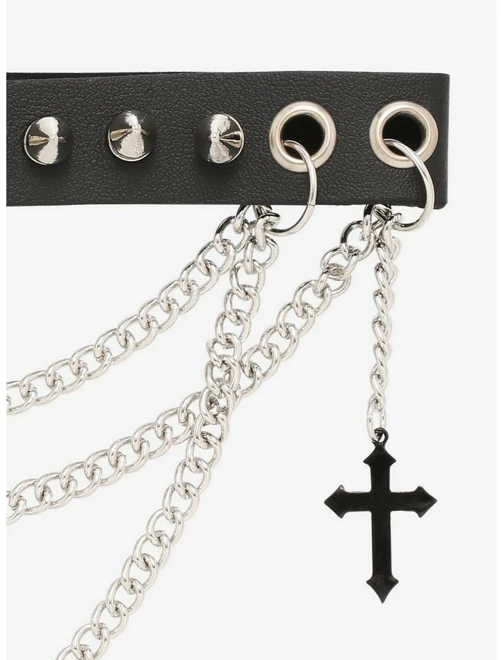 Your outfit can never have too many chains! Add some more dimension to your edgy fit with this spiked choker, featuring multilayered silver-tone chains running across the front, plus a dangling black cross charm on the side.