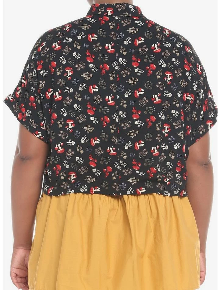 ย A new mushroom top won’t take up mush room in your closet! This woven button-up has a cropped, boxy fit and boasts a fun(gi) print of all sorts of mushrooms.