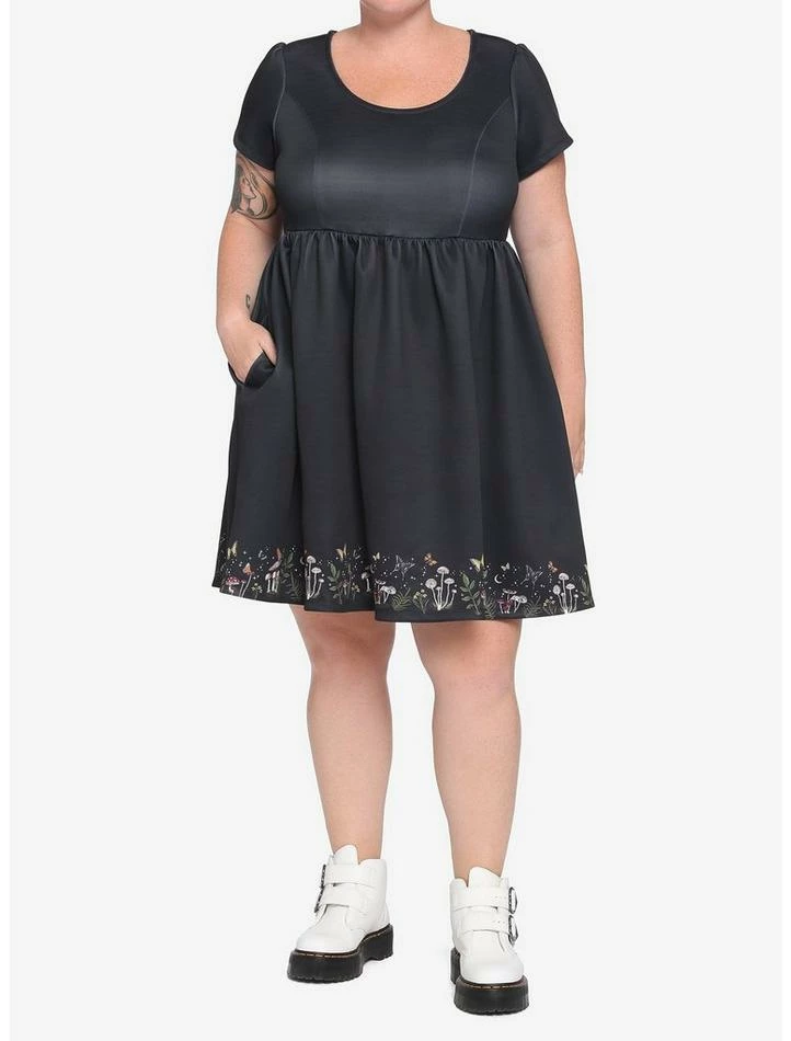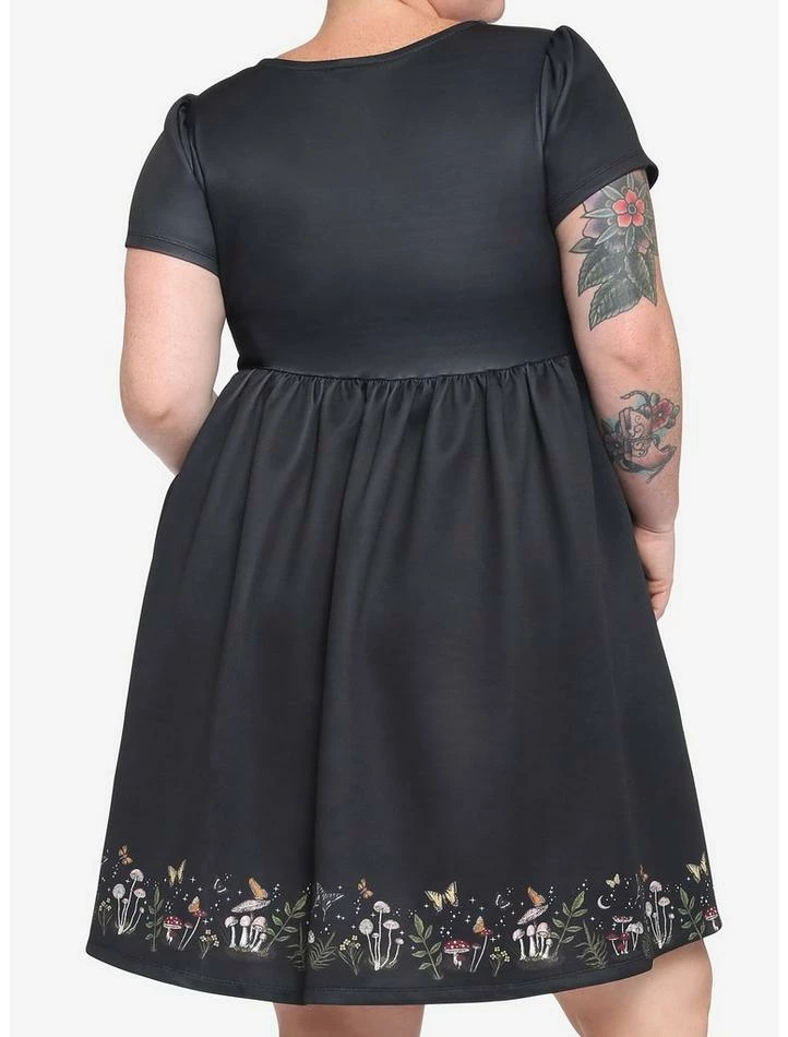 ย Be the queen of the cottagecore scene! This black babydoll dress features a mushroom- and butterfly-lined border as well as pockets, for stowing away all your foraging spoils.