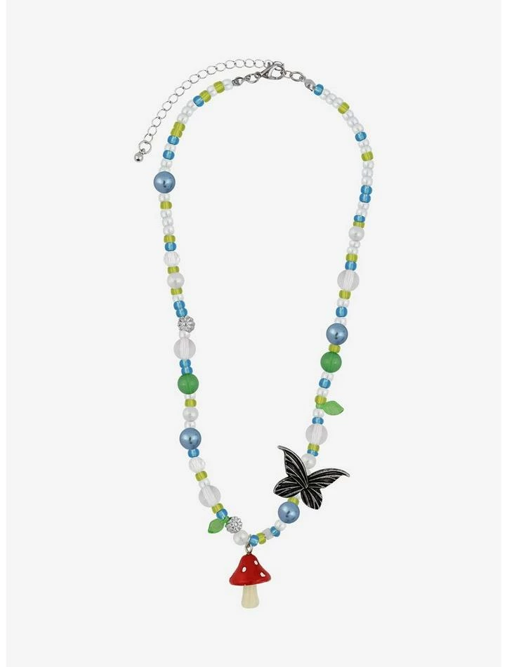 Look like you’re frolicking in fields of flowers with this beaded necklace. It features multicolored beads and mushroom, butterfly, leaf and flower accent beads.