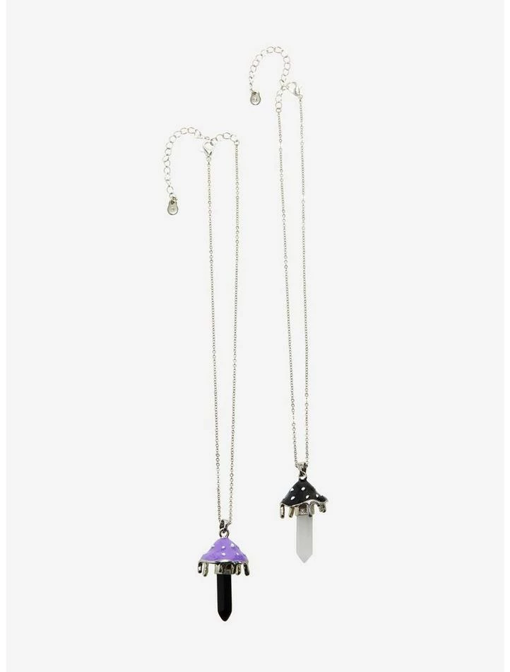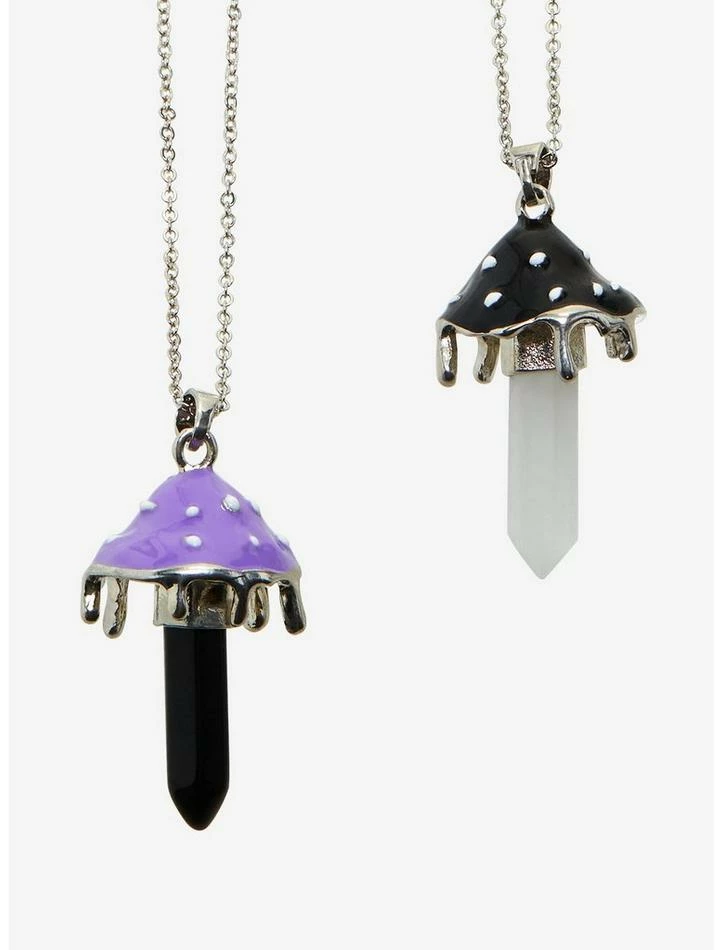 Make some shroom for a new matching necklace with your bestie! This whimsical set features purple and black dripping mushroom pendants with faux crystal accents.