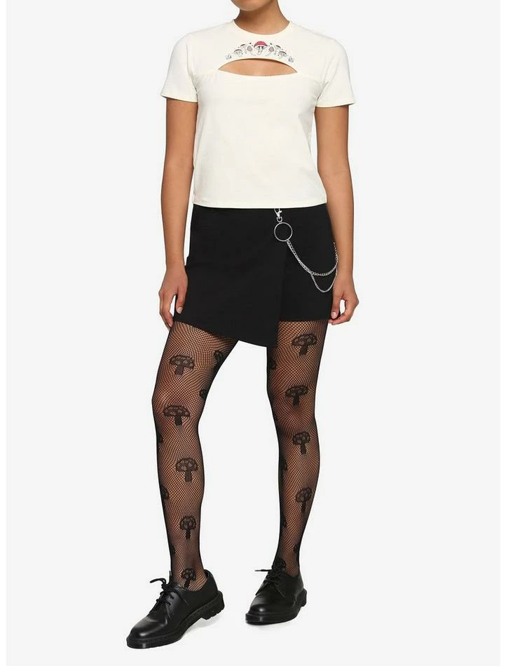 Cottagecore, but keep it minimalistic. This ivory, shirt has cutout detailing at the chest, with various mushrooms and butterflies printed above. The cropped and fitted silhouette is not only flattering, but pairs nicely with a cute skirt and Mary Janes.