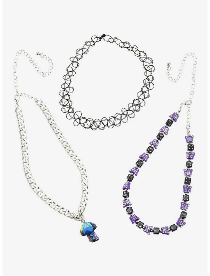 There’s nothing dicey about this choker set! Featuring a silver-tone chain choker with a psychedelic mushroom pendant, plus one with black dice and purple butterfly beads. Complete with a classic, black tattoo choker.
