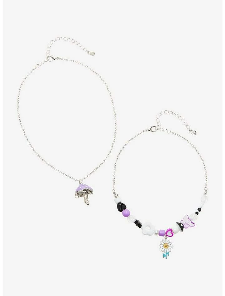 Make some (mush)room for new accessories! These silver-tone chain necklaces feature black, purple and white flower, mushroom, butterfly and heart beads.
