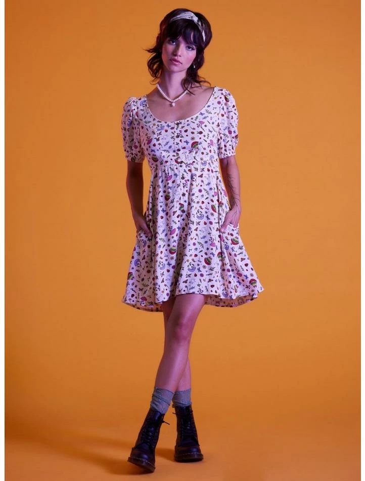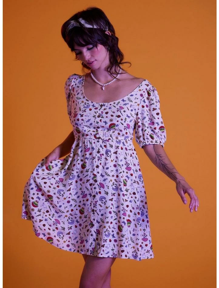 Every cottagecore cutie needs an adorable dress in their closet! This one features a toss print of mushrooms, frogs, bugs and other woodland flora and fauna. Comes with elasticated waistband and arm openings, with faux buttons down the front. And of course, pockets!