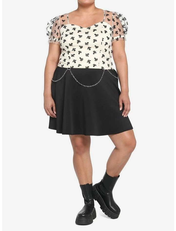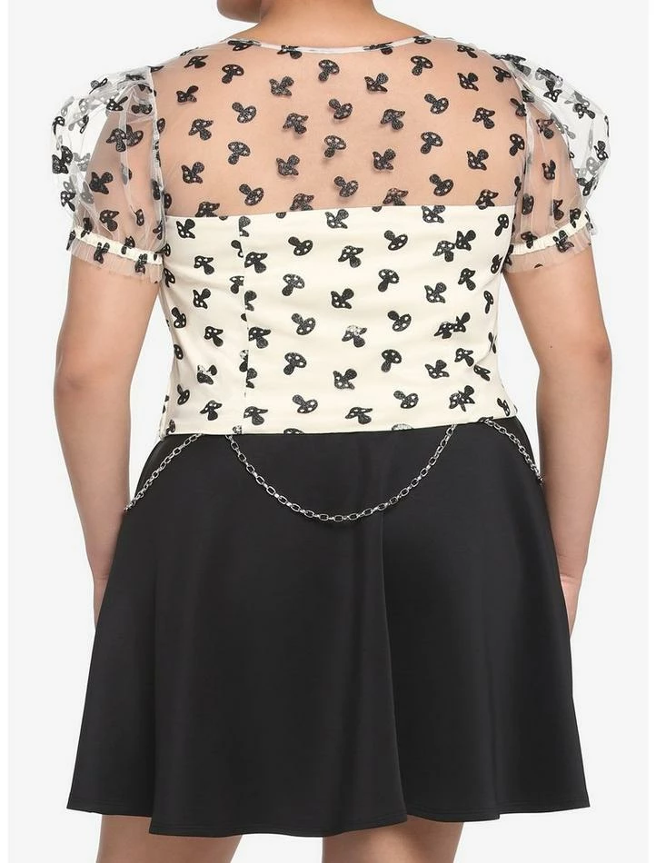 Make some shroom in your closet for a brand new top! Add some romantic vibes to your cottagecore wardrobe with this sparkly top, featuring a sweetheart neckline and a tulle overlay with an overall pattern of glittery mushrooms. Complete with puff sleeves and a side zipper closure.