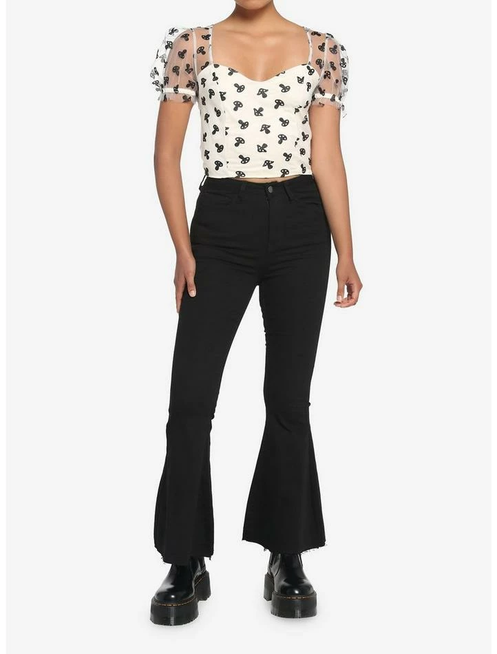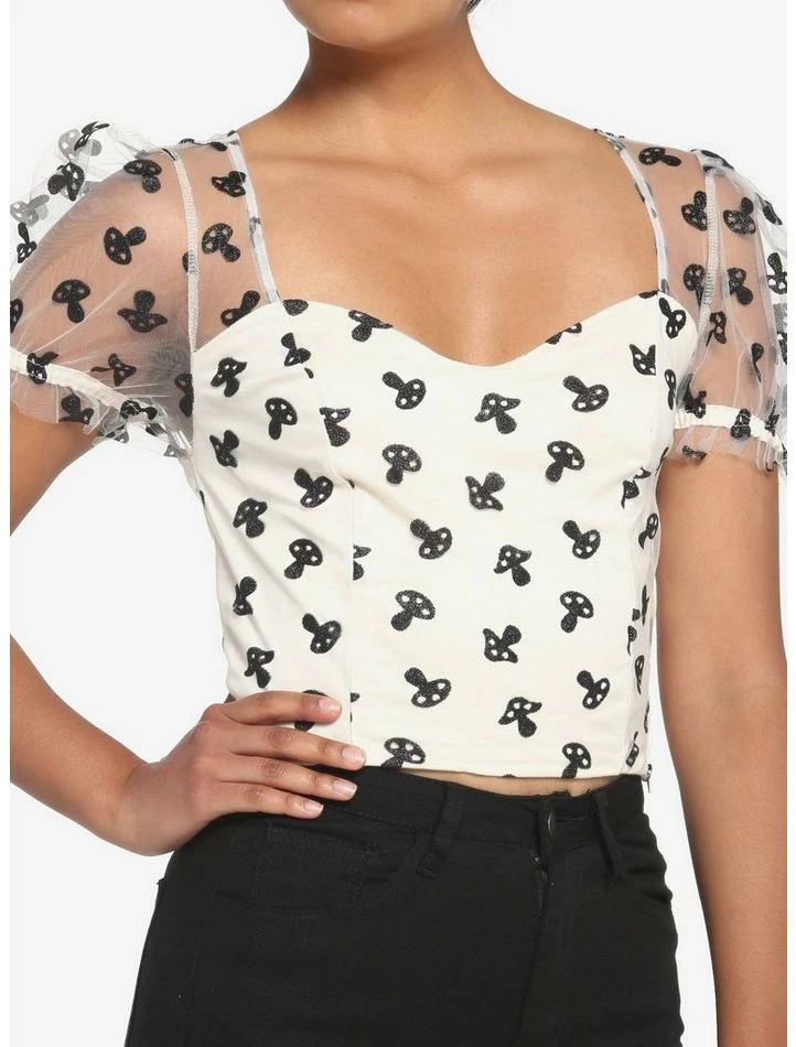 Make some shroom in your closet for a brand new top! Add some romantic vibes to your cottagecore wardrobe with this sparkly top, featuring a sweetheart neckline and a tulle overlay with an overall pattern of glittery mushrooms. Complete with puff sleeves and a side zipper closure.