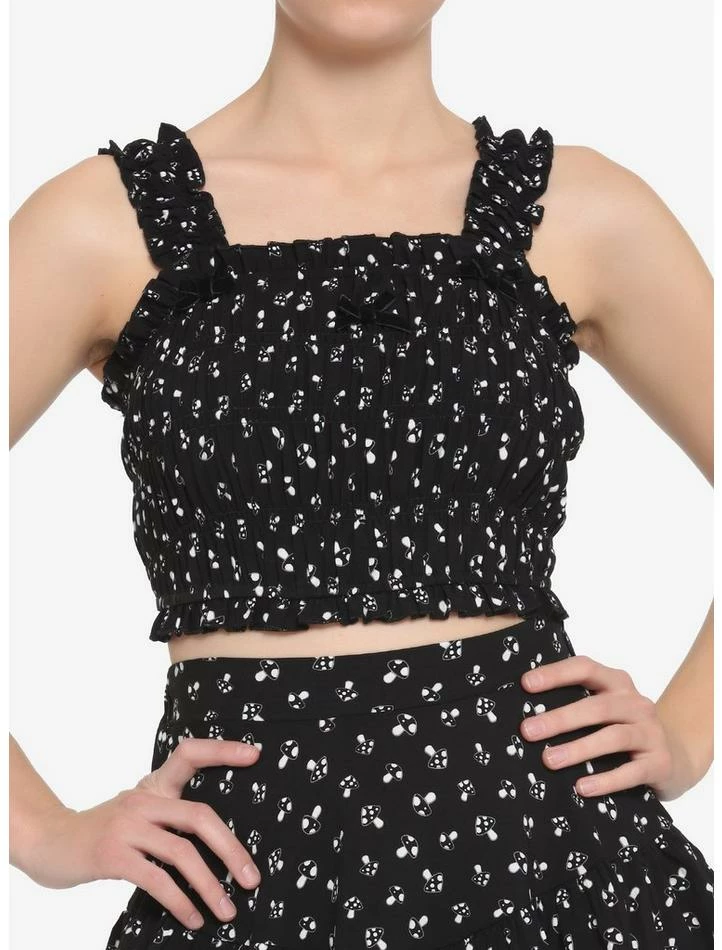 You’ll love this crop top so mush! It features an allover mushroom print, and smocked and cropped for a flattering look. Small black velvet bows adorn the neckline.