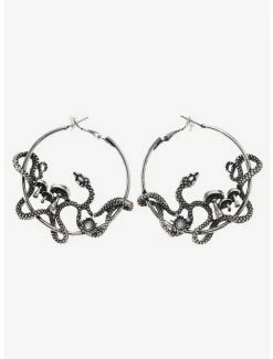 Add a touch of nature to your outfit with this pair of statement earrings! These large silver-tone hoops have a snake wrapped around the bottom half, with a sun and mushroom charms throughout.