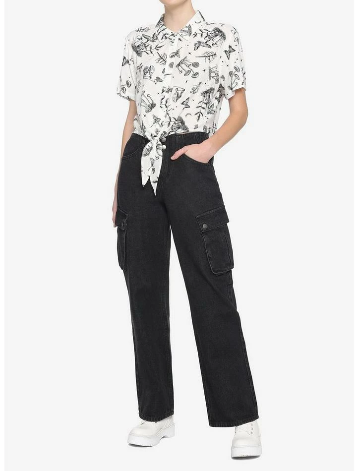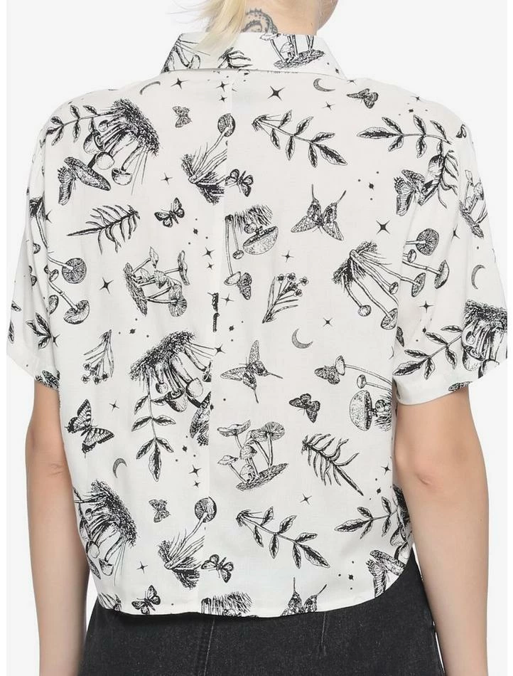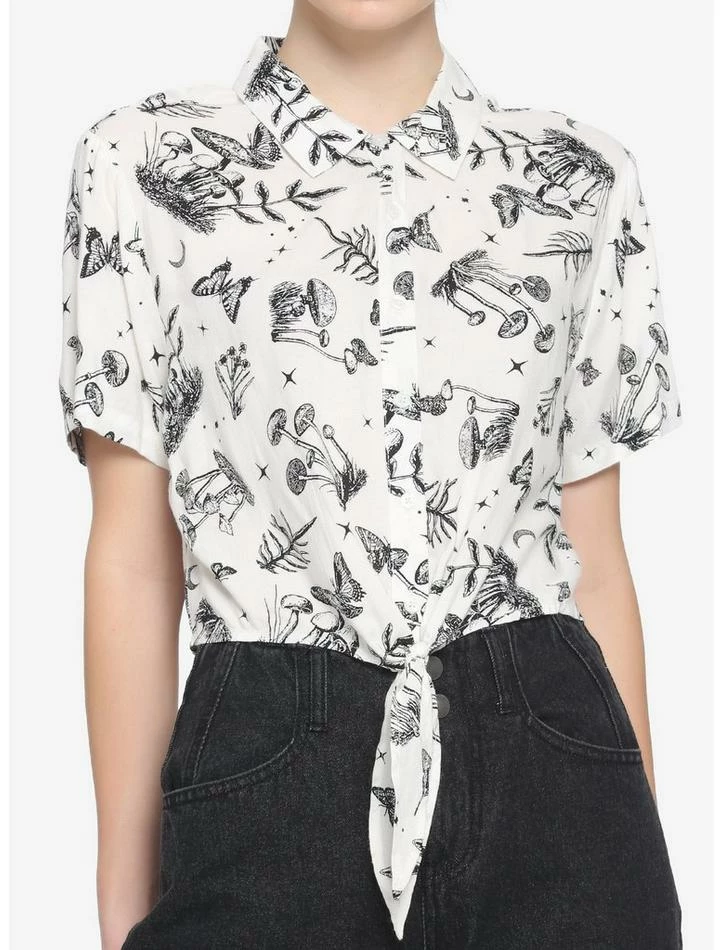 Conjure up some cottagecore vibes in your wardrobe with this tie-front woven top. It features an allover print of different mushrooms, butterflies, stars and crescent moons against a pretty cream fabric. Functional buttons and a tie front, with a slightly cropped fit.