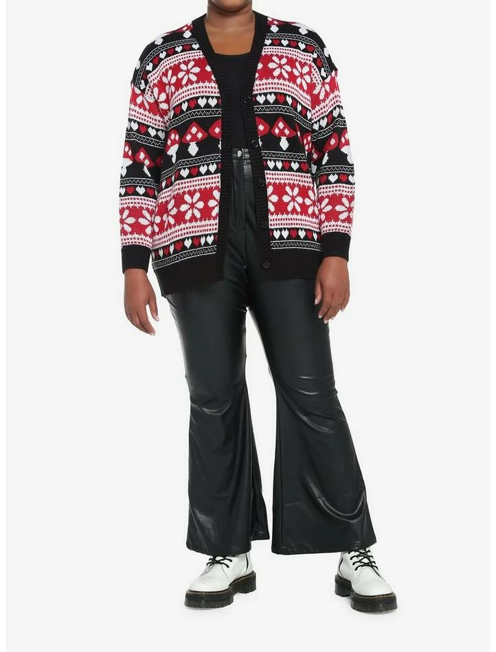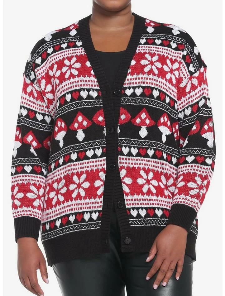 Love the holidays but don’t want to brighten up the way you dress? This fair isle sweater is just your style. It features mushrooms, hearts and flowers in a fair isle knit. It has an oversized fit and button-down front.