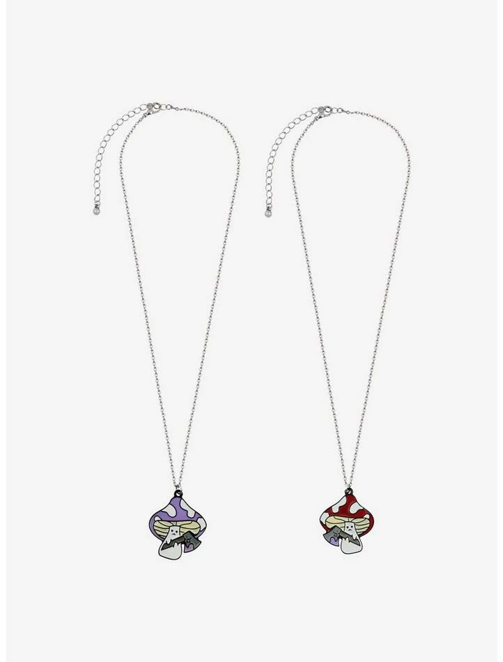 Don’t mess with these mushrooms. This set includes two silver tone chain necklaces with mushrooms holding axes pendants.Β