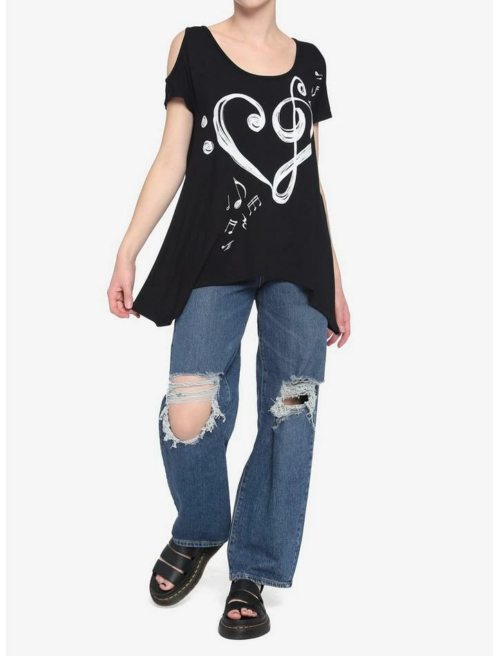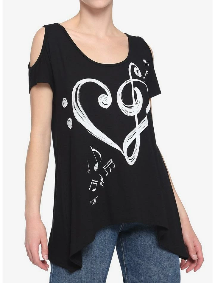 Without music, life would B-flat! Show your love for music with this cold shoulder drapey top, featuring music notes surrounding a treble clef and bass clef heart.