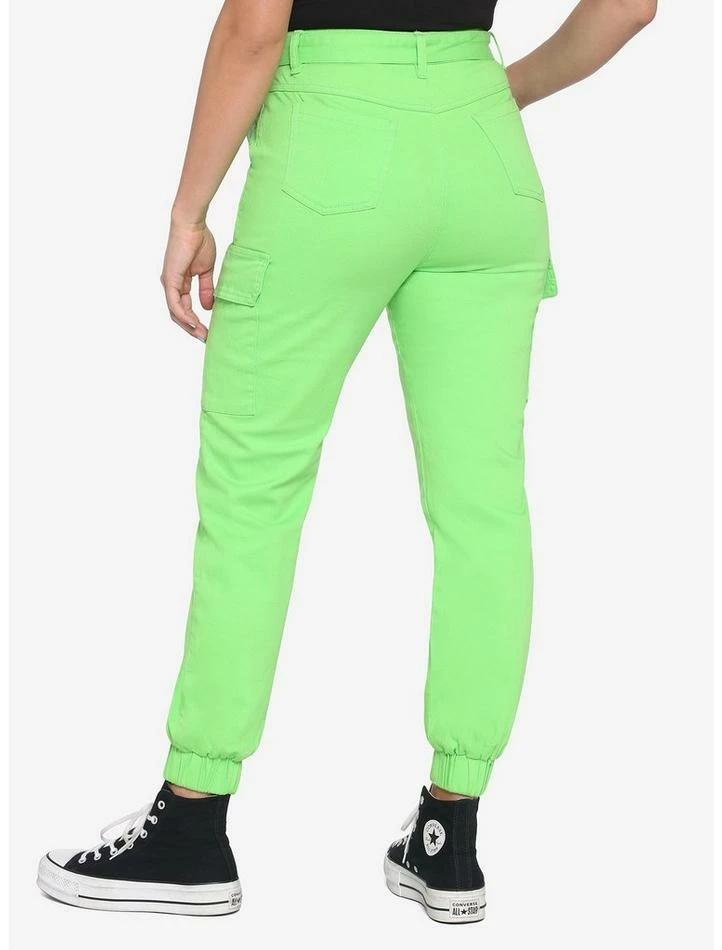Stand out in these neon green jogger pants featuring a silver tone grommet belt, cargo pockets, elasticated cuffs and zipper and button closure.