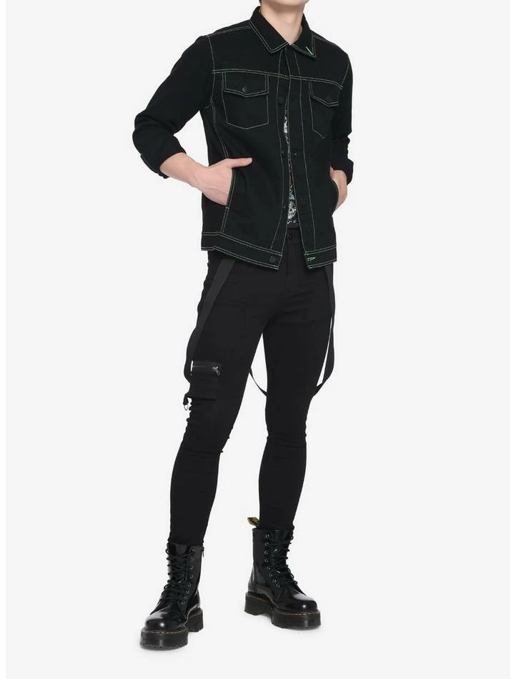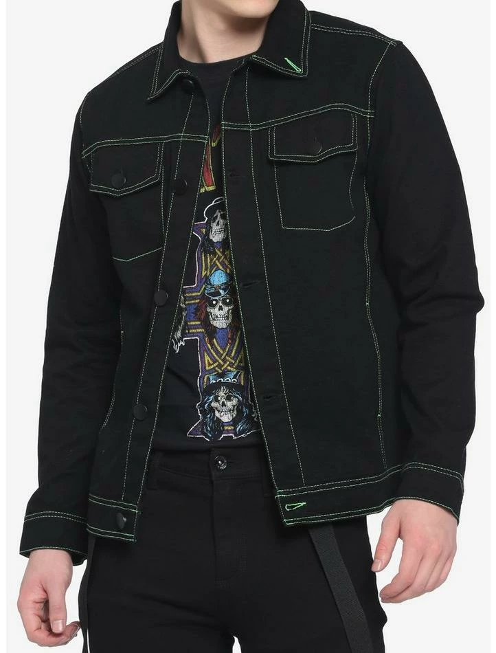 Add a pop of color to your outerwear with this button-down denim jacket. This sturdy black denim jacket can liven up any look with its neon green stitching, and features front chest pockets and side pockets.