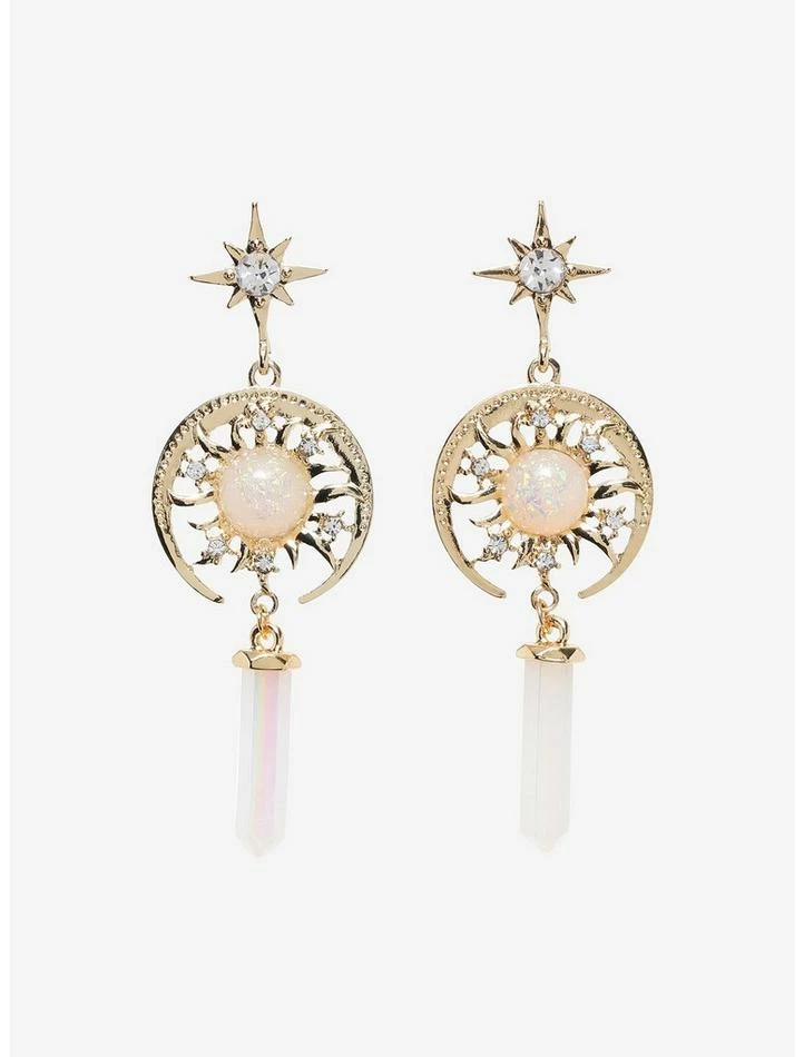 Let your jewelry collection shine with these statement earrings! Add a celestial touch to your look with these drop earrings, featuring star studs with gem centers, and a crescent moon framing a sun with an opalescent gem center, with more embedded gems throughout. Comes with a dangling faux crystal at the ends, too!