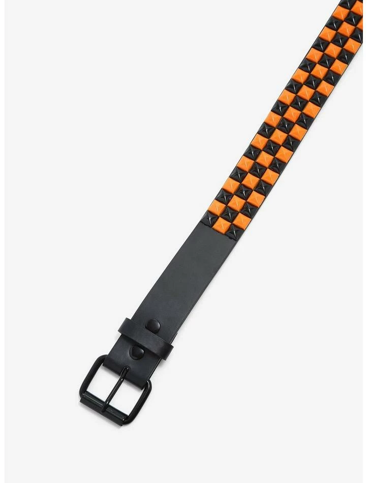 In honor of Halloween, retire the black and white checkered belt… in exchange for a black and orange checkered belt! Belt features three rows of black and orange pyramid studs in a checkered pattern.