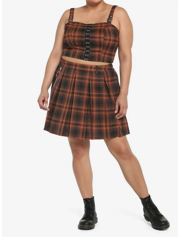 FallΒ in love with this orange plaid skirt! Featuring pleats, a silver-tone removable side chain and side zipper closure. Pair it with the matching top to complete your all-plaid look!