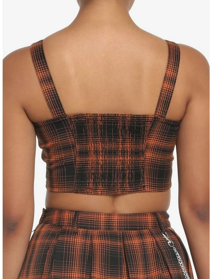 FallΒ in love with this orange plaid tank top! It has a cropped fit and features hook-and-eye detailing down the front and adjustable buckle straps. Plus, there’s ruching on the back for a bit of stretch. Pair it with the matching skirt to complete your all-plaid look!